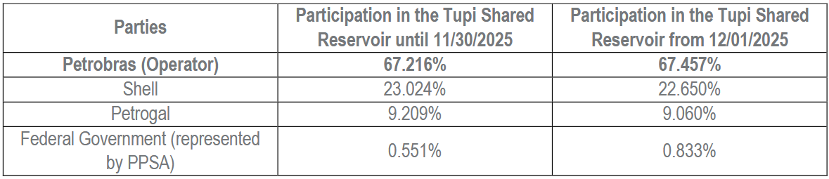 Download Senado Building, Petrobras administrative headquarters in Rio de JaneiroPetrobras following up on the announcement of December 1, 2025, informs that the financial settlements related to the first redetermination of the Tupi Shared Reservoir, located in the Santos Basin, have been completed. This follows the approval of the Fourth Addendum to the Production Individualization Agreement (AIP) of the reservoir, which changed Petrobras’ participation share from 67.216% to 67.457% as of December 1, 2025.