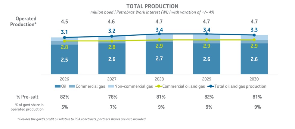 The company also projects an average Total Cost of Produced Oil (TCPO) — which includes lifting costs (below US$ 6/barrel), government participation, depreciation and depletion — of US$ 30.4/boe from 2026 to 2030, considering government take according to the average Brent price estimated as a planning assumption. This represents a reduction of approximately US$ 6/barrel compared to the TCPO estimate from the previous Plan.