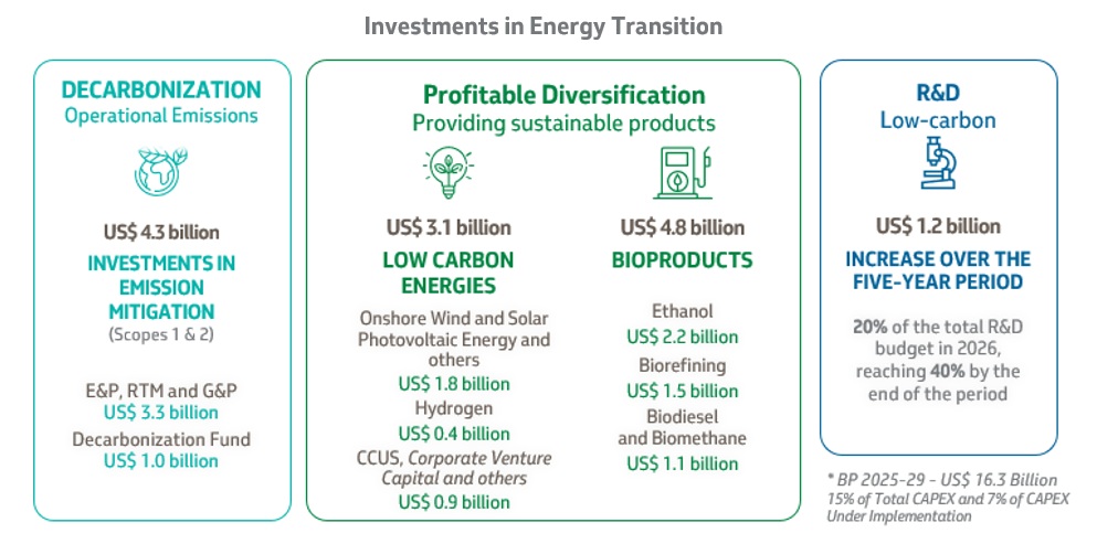 Considering all low-carbon initiatives (Scopes 1, 2 and 3), investments in the energy transition total US$ 13 billion, encompassing projects in Low-Carbon Energies, bioproducts, decarbonization of operations, and Research, Development and Innovation (RD&I) across all segments. This amount represents 12% of the Total Investment and 8% of the Implementation Investment.