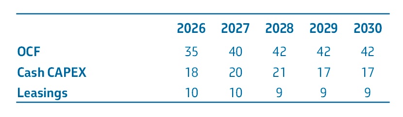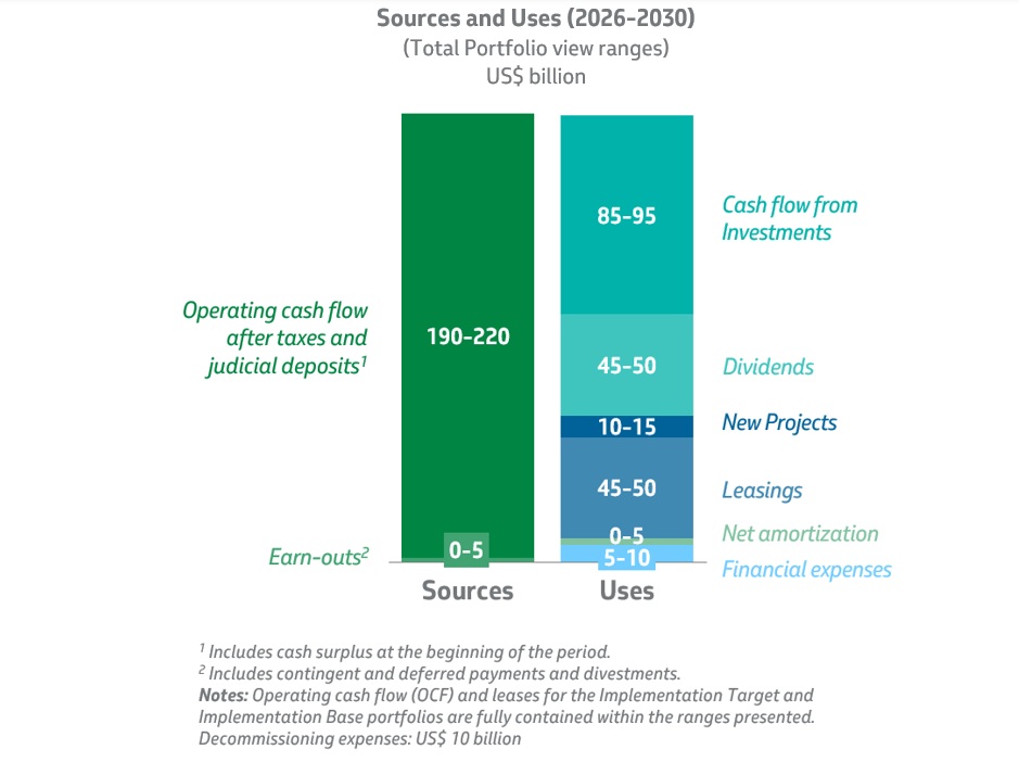 The Plan projects a resilient cash flow, with a Brent breakeven for net debt neutrality of US$ 59 per barrel in 2026 and US$ 48 per barrel in 2030. The BP 2026-30 includes the following annual projections for Operating Cash Flow (OCF), Investment Cash Flow (Cash Capex), and Leasings, related to the Total Portfolio: