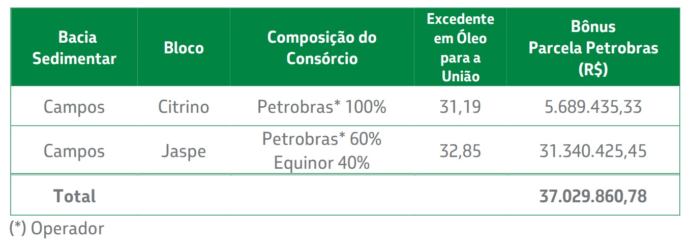 A Petrobras adquiriu o bloco Jaspe em parceria com a Equinor Brasil Energia Ltda. O consórcio terá a Petrobras como operadora, com participação de 60%, em parceria com a Equinor (40%). A Petrobras também adquiriu integralmente o bloco Citrino.