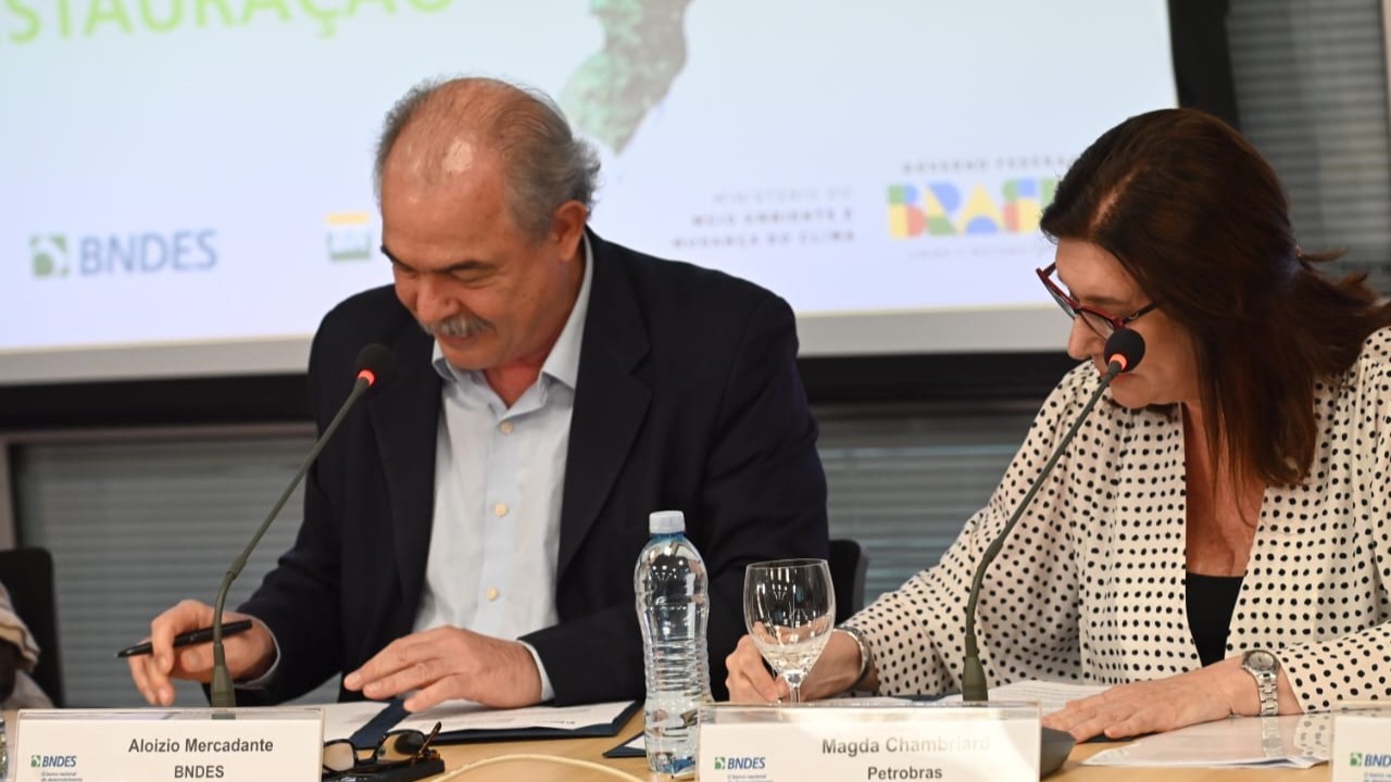 Download O presidente do BNDES, Aloizio Mercadante, e a presidente da Petrobras, Magda Chambriard, assinam protocolo de intenções do Restaura AmazôniaA presidente da Petrobras, Magda Chambriard, e o presidente do BNDES, Aloizio Mercadante, assinaram nesta quarta-feira (13/11) o protocolo de intenções do Restaura Amazônia, programa de restauração ecológica com geração de emprego e renda na Amazônia Legal. A nova parceria prevê o investimento de R$ 100 milhões nos próximos cinco anos, sendo R$ 50 milhões do Fundo Amazônia.