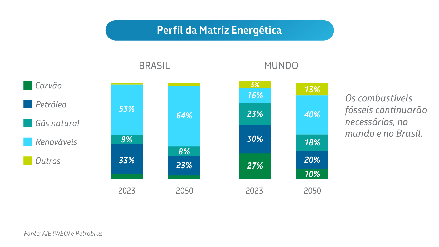 Perfil da Matriz Energética Brasil e Mundo. Os combustíveis fósseis continuarão necessários, no mundo e no Brasil.